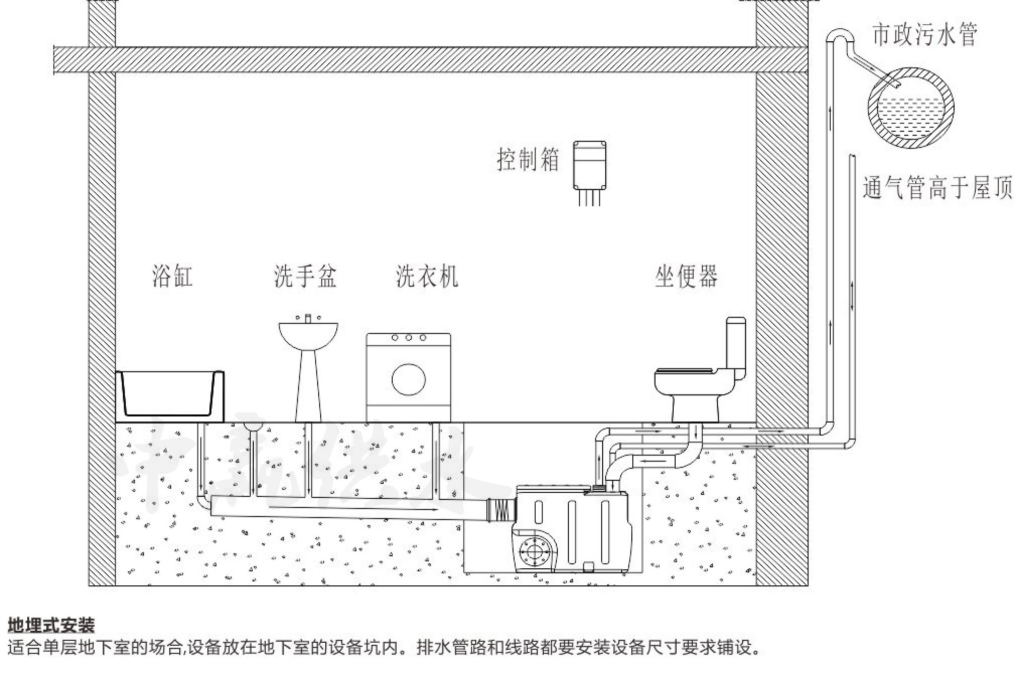 各類建筑地下室、辦公樓地下室、地鐵車站、地下商場等各類地下建筑的污水的排放問題使地下室自動污水提升器應運而生,其排水過程是污水通過整套設備的入口自流進入集水箱,到達設備的啟動水位后,設備自動啟動,將污水提升排放到市政管網。下面中贏供水小編來為大家講解地下室自動污水提升器安裝示意圖、使用方法。